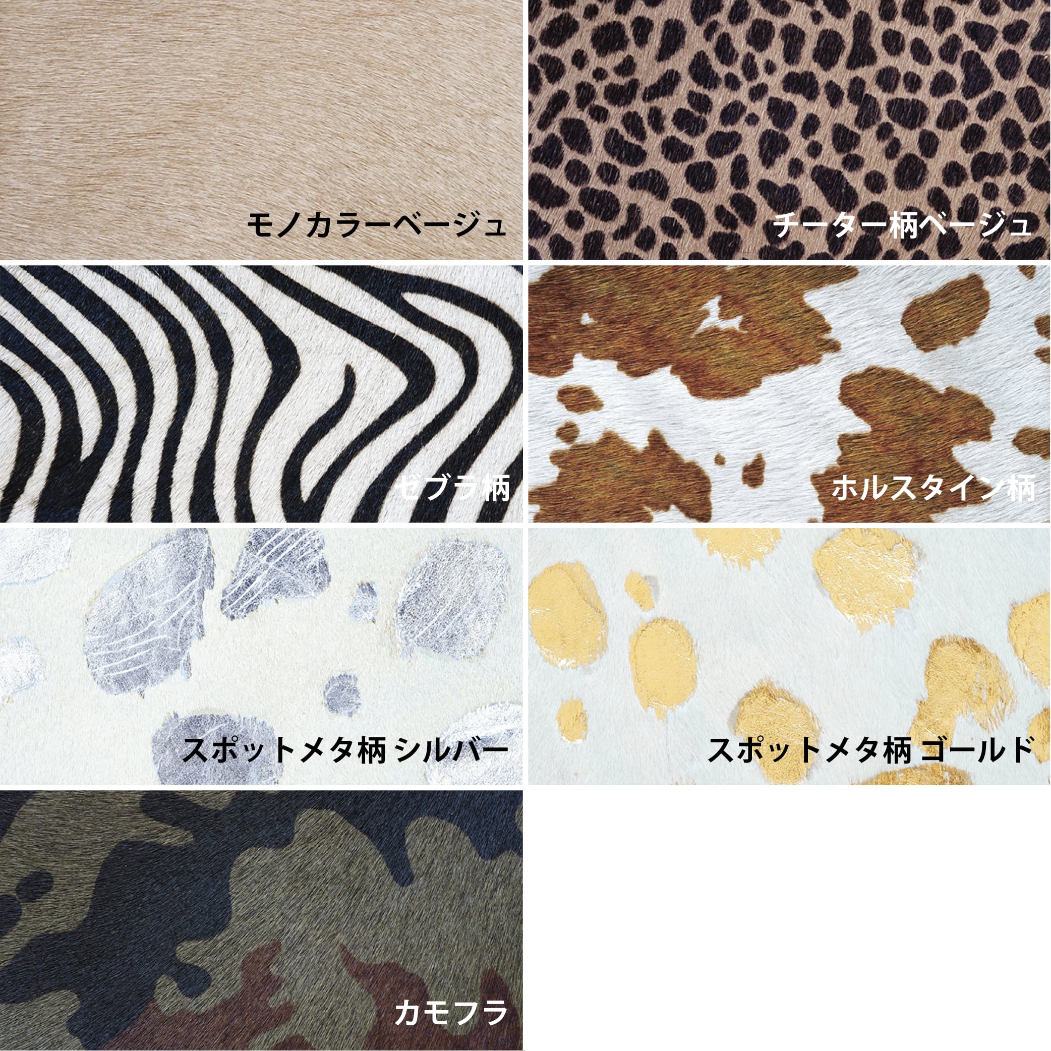 ※ハラコの柄は裁断の場所・部位によって柄の出方がそれぞれ異なります。あらかじめご了承くださいませ。
