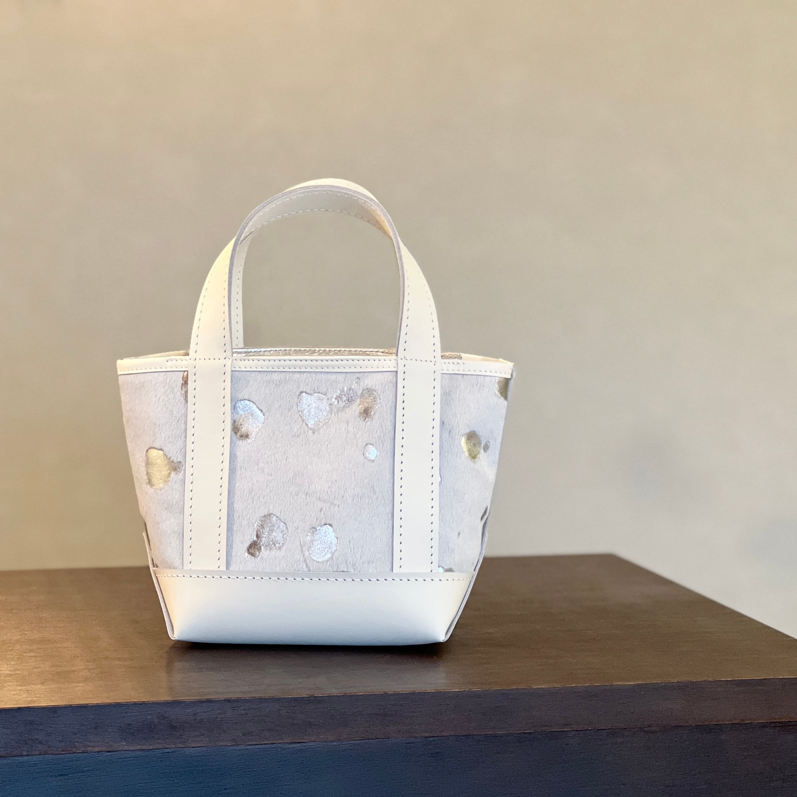 スポットメタ柄は、毛付きの革に薬品を垂らして部分的に脱毛し、